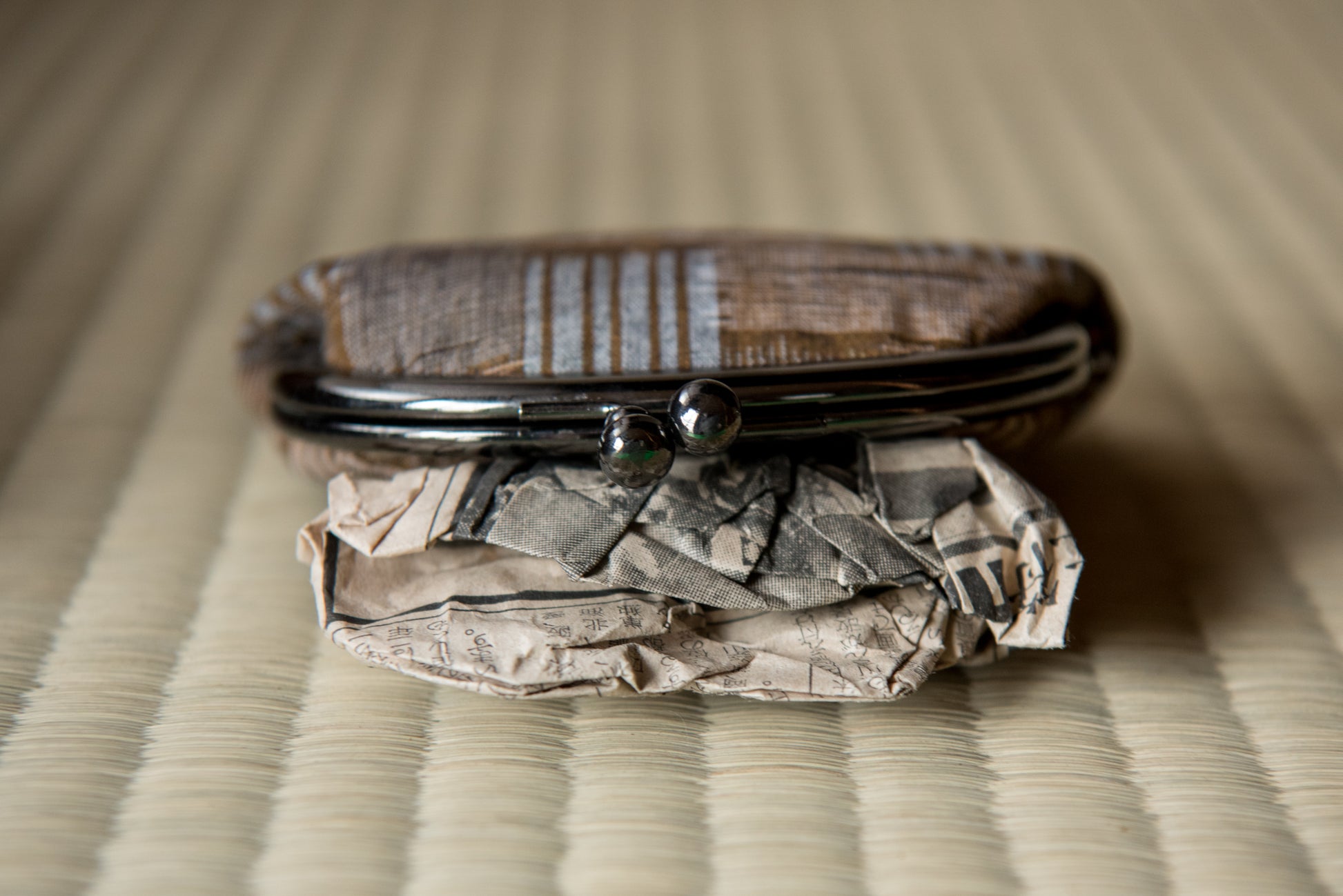 Vintage item. This is a small coin purse, from Japan's Showa-era. The exterior fabric of the purse is a nice pattern of brown, blue, and white. While I know that Japan has traditionally made some things like this out of former kimono fabric, I do not know if this particular coin purse is made from kimono fabric, or not, so I can't say for certain. The interior fabric is a lovely maroon color with a velvet feel. The clasp is a dark colored metal.